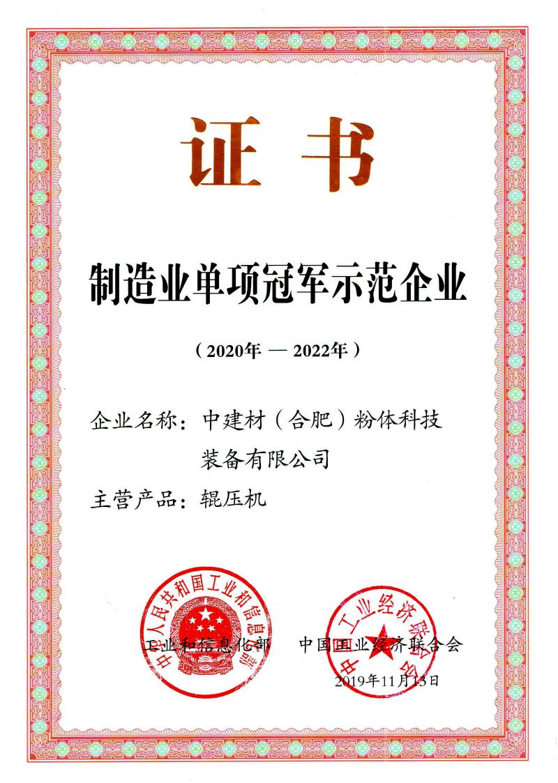 中建材(合肥)粉体科技装备有限公司前身为合肥水泥研究设计院粉磨研究所,2011年8月,经合肥水泥研究设计院粉体工程公司与肥西节能设备厂联合改制组建而成,国家高新技术企业,全国首批“制造业单项冠军示范企业”,中国建材集团“六星企业”。